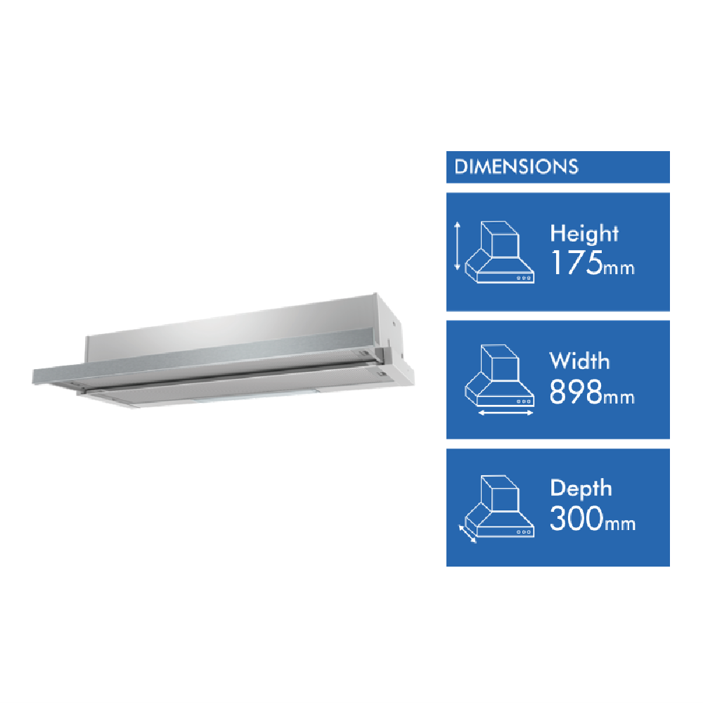Slide your cooktop ventilation worries away with the Westinghouse 90cm Slideout Rangehood. This sleek and modern rangehood features a smooth grey and stainless steel finish that will complement any contemporary kitchen. With its powerful 340 cubic meters per hour extraction capacity this ducted rangehood swiftly eliminates cooking odors grease and smoke. The two brilliant LED lights illuminate your cooktop while the three fan speeds provide options for every meal. The removable grey fascia and dishwasher-safe aluminum filters ensure this rangehood is easy to clean. Westinghouse includes their signature low noise energy efficient motor that operates between 57 to 66 decibels. Expand your ventilation coverage by simply sliding out the rangehood when needed. Then slide it back against the wall when not in use. With a width of 898mm height of 175mm and depth of 300mm this rangehood fits above most 90cm cooktops. It also comes with a two year manufacturer's warranty for peace of mind. Give your kitchen powerful yet quiet ventilation with the Westinghouse Slideout Rangehood. The manufacturer's part number for this product is WRR904SB.