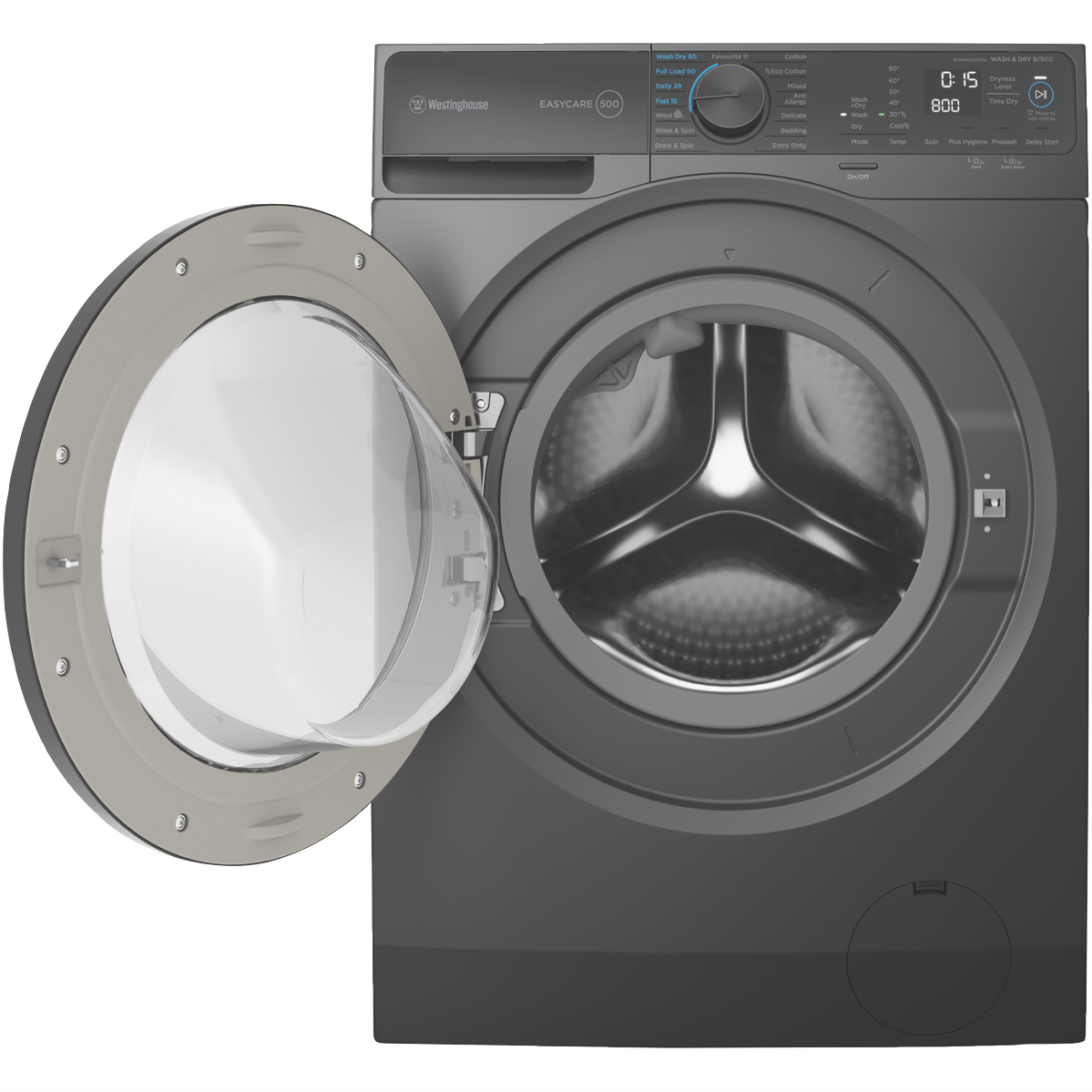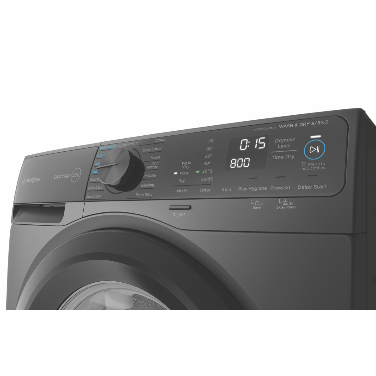 Discover the ultimate laundry solution with the Westinghouse 9kg-5kg Combo Washer Dryer. This innovative appliance seamlessly combines washing and drying capabilities making laundry day a breeze. With a generous 9kg washing capacity and 5kg drying capacity this combo washer dryer is perfect for households of all sizes. The sleek grey finish adds a touch of sophistication to any laundry room. Enjoy a wide range of 15 washing programs including delicate mixed fast 15 daily 39 full load 60 extra dirty bedding and gym wear catering to all your laundry needs. The washer dryer also offers convenient options like rinse hold extra rinse plus hygiene delay end spin selection wash temperatures and variable spin speeds up to 1200rpm. The inverter motor ensures quiet and efficient operation while the 3XL drum opening allows for easy loading and unloading. Save your favorite programs for quick access and take advantage of the pause and add button for added flexibility. With a 4-star WELS water rating and 5-star wash energy rating this combo washer dryer is both water and energy efficient. The manufacturer's part number for this product is WWW9024M5SA. Experience the convenience and performance of the Westinghouse EasyCare combo washer dryer in your home today.