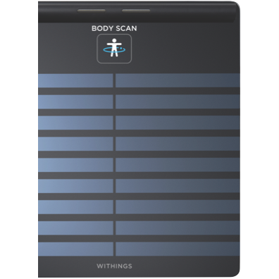 Track your health and fitness progress seamlessly with the sleek black Withings Body Scan bathroom scale. This smart scale provides instant insights into your weight full body composition and overall health using advanced bioelectrical impedance analysis technology. Simply step on the scale each morning to get your weight along with metrics like body fat and water percentage muscle and bone mass. The extra large tempered glass platform comfortably fits feet of all sizes while the high contrast display clearly presents your data. Easily create custom profiles for up to 8 users to track progress overtime. And it automatically syncs your stats via WiFi or Bluetooth to the Withings app on your iOS or Android device. With no need to manually enter data you'll stay motivated on your health journey. The Withings Body Scan empowers you to take control of your wellbeing.(MPN: WBS08-BLACK 12 month warranty 4.4kg 327 x 327 x 23mm)