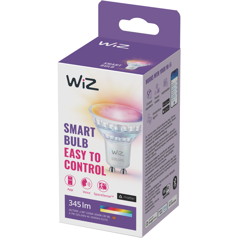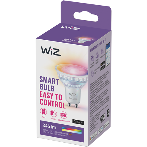 Transform your home lighting with this smart GU10 downlight bulb that connects to your Wi-Fi for complete control. You can adjust the colour temperature from warm 2200K to cool 6500K to match any mood or time of day. Because it works with Amazon Alexa Google Home and Apple HomeKit you can easily control it with your voice or smartphone. With a brightness of 345 lumens and a 15000-hour lifespan this bulb will serve you well for years to come. Comes with a 2-year warranty. Model WIZWCAGU10BTV2.