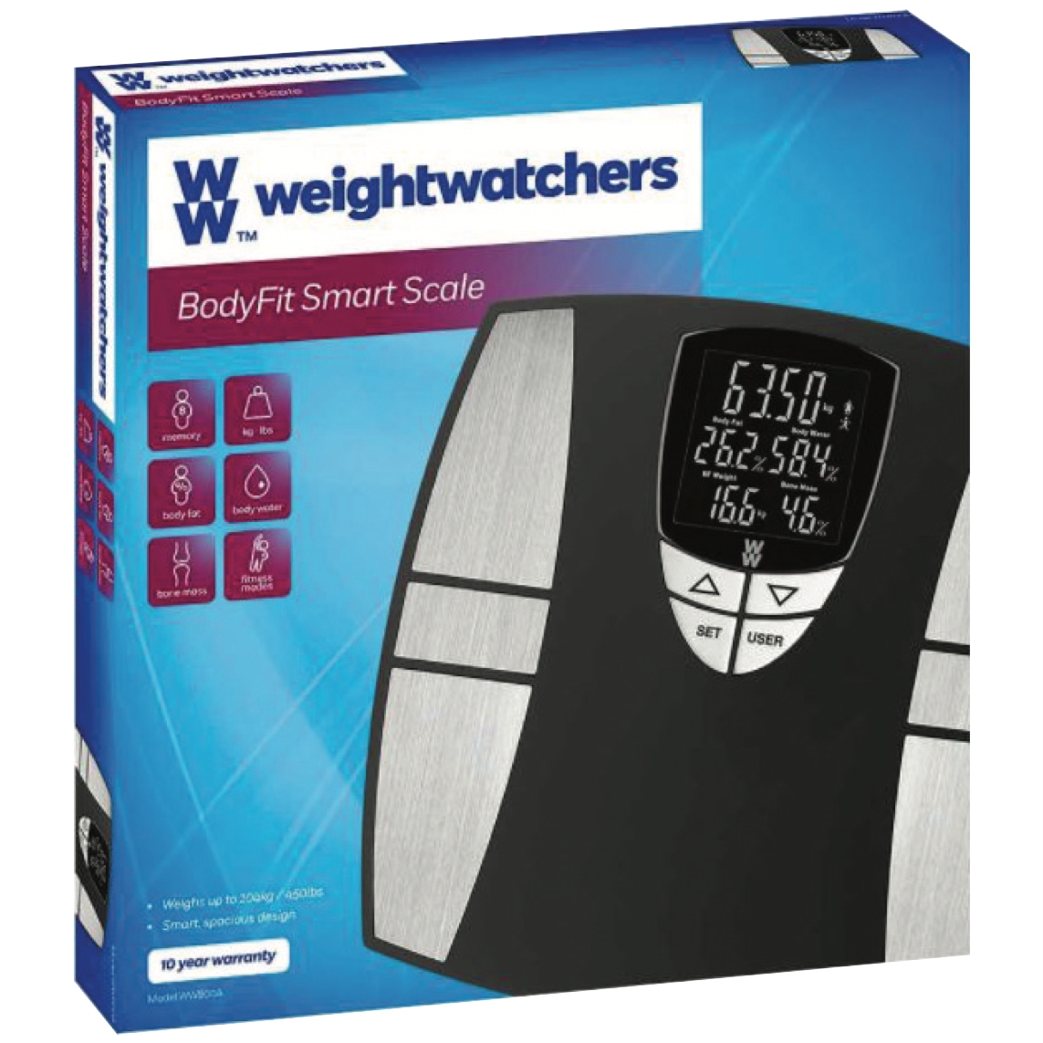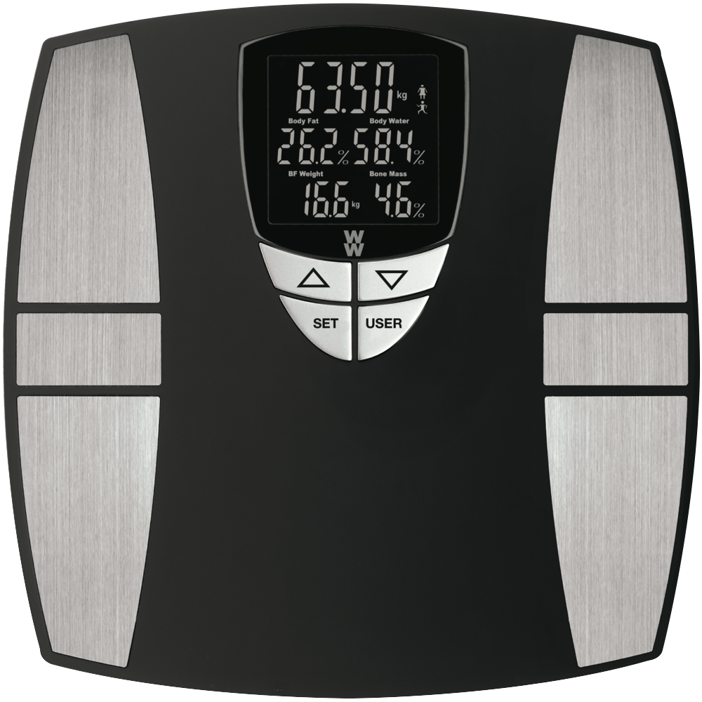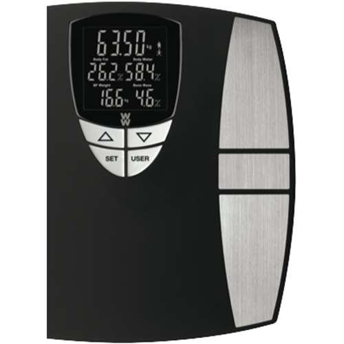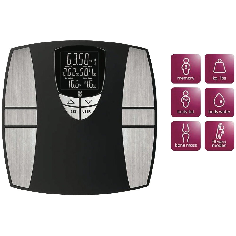 Step onto the sleek WW Bodyfit Smart Scale and unlock a wealth of insights into your health. This bathroom scale uses precision sensors to measure your weight body fat percentage body water bone mass and more. The black matte finish with stainless steel accents adds modern style to any bathroom. Simply tap your feet to activate the extra-large backlit display which clearly shows your weight body composition stats and recognises up to 8 user profiles. Weighing up to 204kg this smart scale utilises a multiple load cell system with electronic strain gauges to ensure accurate readings every time. Sync your stats with the WW app to track your progress. With a 10 year warranty from the manufacturer this scale is built to last. The manufacturer's part number for this product is WW800A. Bring home the WW Bodyfit Smart Scale and take control of your health today.